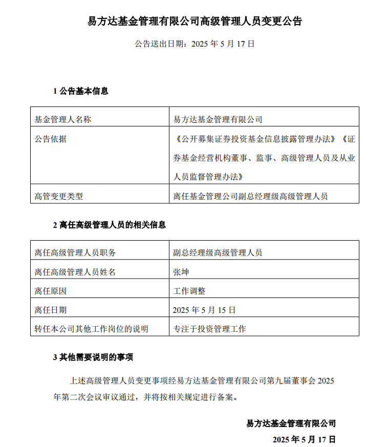 5月16日晚间,易方达蓝筹精选混合型证券投资基金发布易方达基金高级管理人员变更公告,因工作调整,张坤不再担任副总经理高级管理人员,后续将专注于投资管理工作。